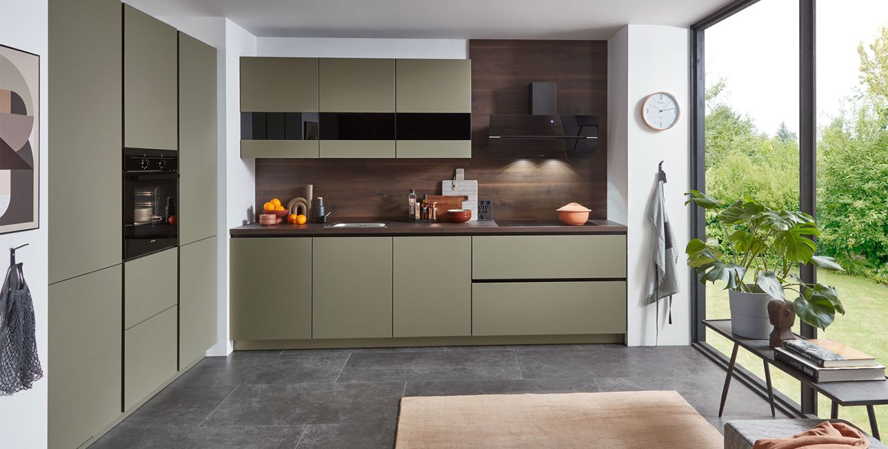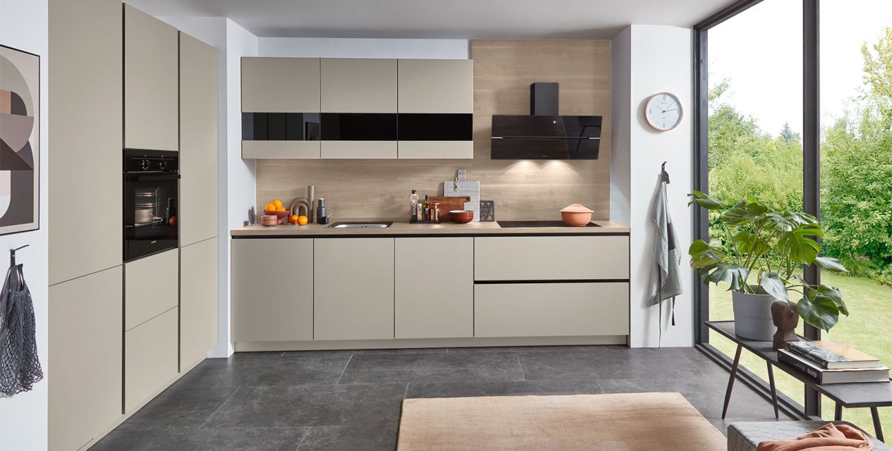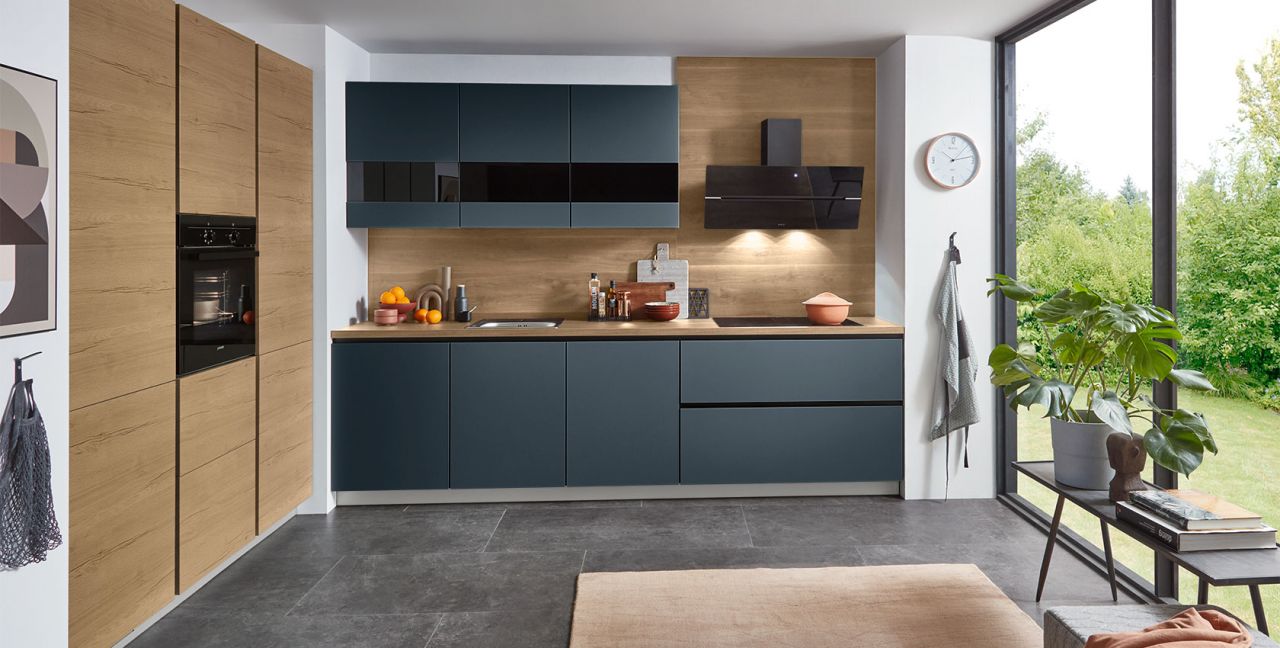 Inklusive Einbaubackofen schwarz Junker JF1300061 Energieeffizienzklasse A, Glaskeramik Kochfeld Junker JR36DT54, Designesse Edelstahl / Schwarzglas Elica WISE90BK Energieeffizienzklasse B, Kühlschrank Laurus LKG122E Energieeffizienzklasse E, Einbauspüle Edelstahl Rodi NewManaus, XL-Schränken, Unterschrank mit Großraumauszügen, Wandschränken mit Segmentglastüren.